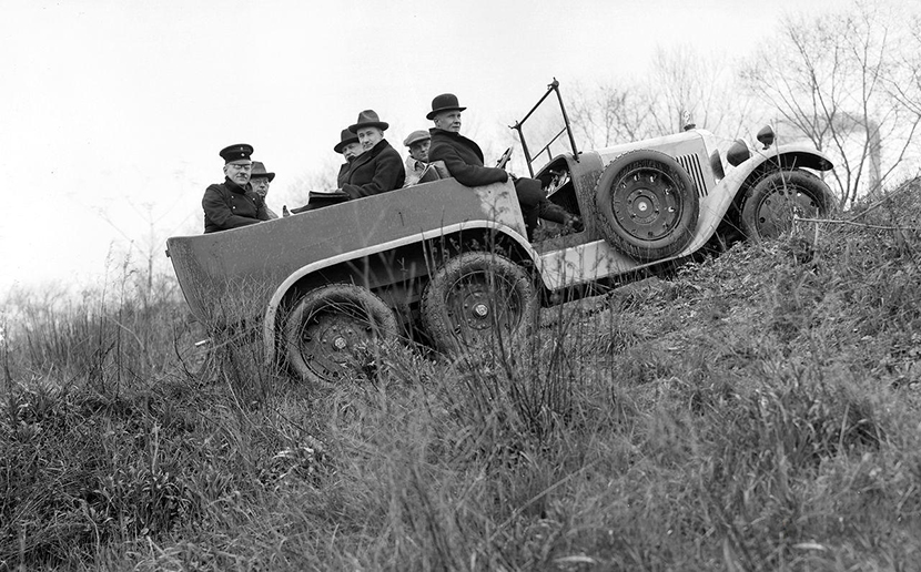 Из них первой подобной моделью принято считать автомобиль Peugeot 1921 года выпуска. Однако ничего общего с истиной это заблуждение не имеет – у данной модели по центру кузова лишь приторочена «запаска», которая если и крутилась, то лишь на месте внезапно поврежденного колеса.
