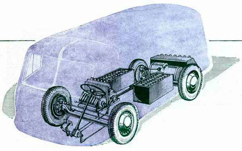 На грузовую платформу машины были установлены деревянные ящики, где размещалось четыре десятка аккумуляторов общей массой 1400 кг. Суммарная емкость этих батарей составила 168 А/ч. Своей энергией они питали электродвигатель, располагавшийся под кабиной.