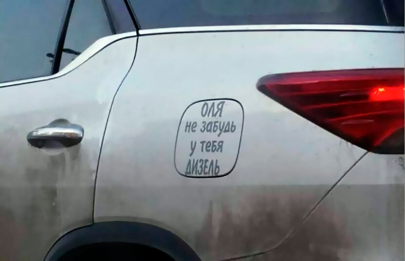 Эта надпись на лючке бензобака уже давно стала популярным интернет-мемом, как и ответ той самой Оли: «У меня «Хёндэ», а не дизель». На самом деле заботливый супруг знал, что делал, когда заказывал такую гравировку, так как эта невинная, казалось бы, ситуация чревата глобальными и дорогостоящими последствиями для любого авто.