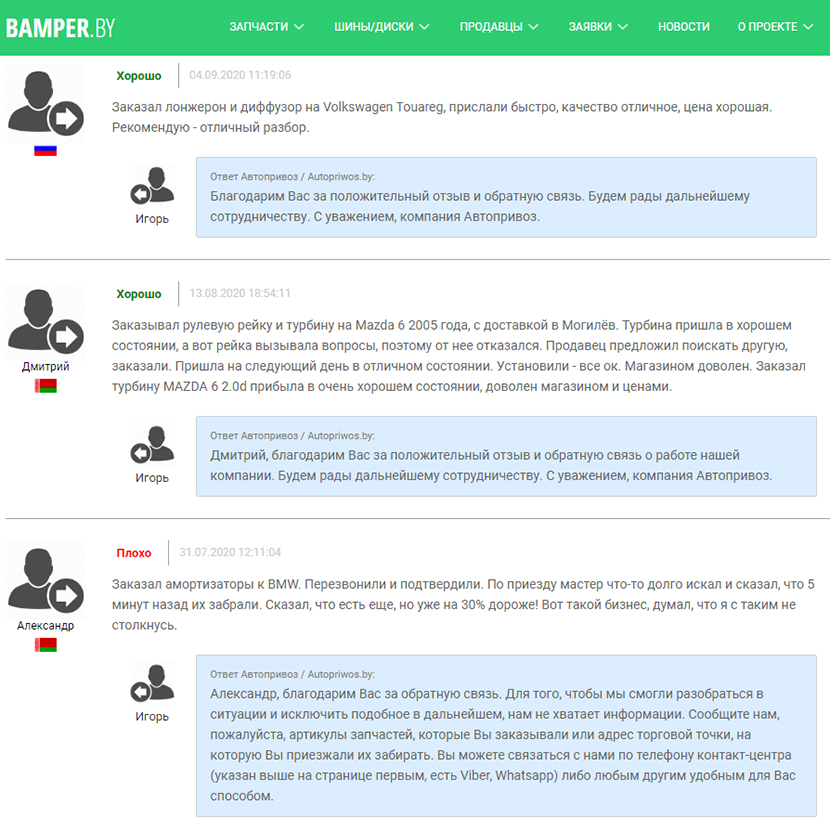 Bamper.by работает над проверкой отзывов. Мы не выступаем в роли третейского судьи. Главный критерий – честные отношения между продавцом и покупателем. И мы действительно стараемся разобраться в проблеме, если она серьезна. Пытаемся понять суть вопроса, ведь от исхода сделки зависит не только текущая операция, но и в целом репутация продавца.