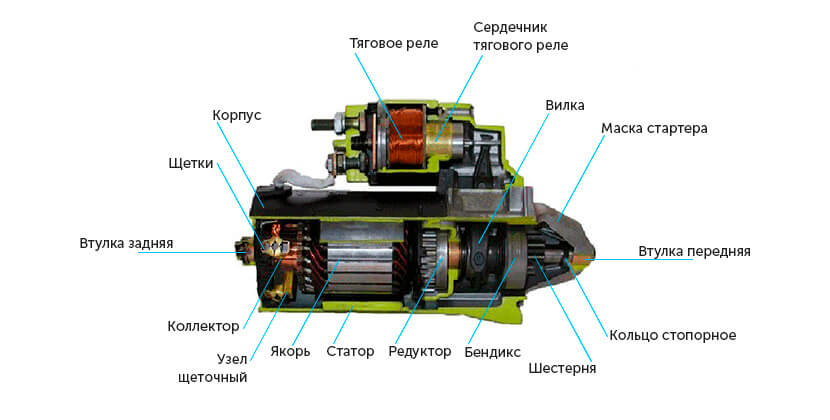 Среди самых типичных признаков гибели стартера следует выделить следующие: