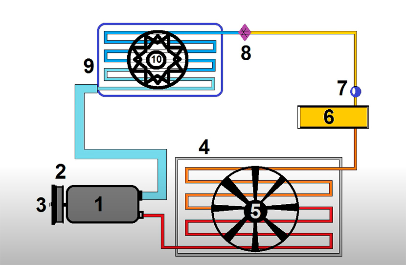 При нажатии на кнопку включения кондиционера срабатывает электромагнитная муфта (3), запускающая компрессор (1). Компрессор сжимает газообразный фреон, отчего тот сильно нагревается, и гонит его в конденсор (4), в народе называемый радиатором. В конденсоре сильно нагретый сжатый фреон охлаждается, в чем ему помогает вентилятор (5), включаемый одновременно с компрессором.