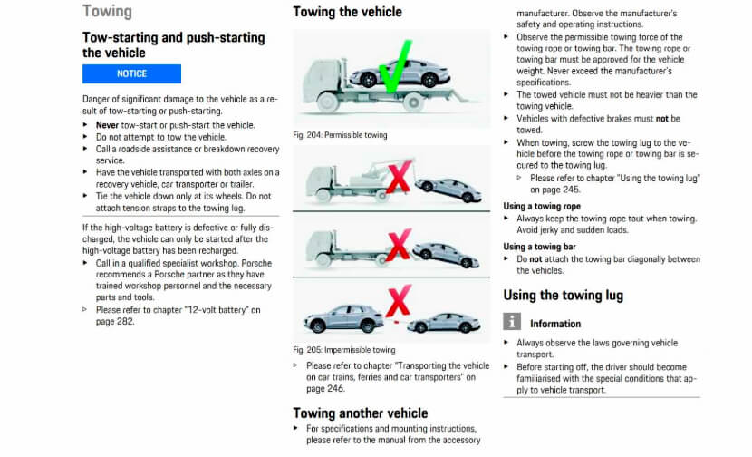 Но даже в этом случае ехать со скоростью более 55 км/ч нельзя, а весь путь буксировки не должен превышать 10 метров! То есть, столь сложные действия выполняются лишь исключительно для погрузки. А в инструкции к Porsche Taycan, в которой установлены синхронные электромоторы на обеих осях, и вовсе говорится, что транспортировка возможна только методом полной погрузки.