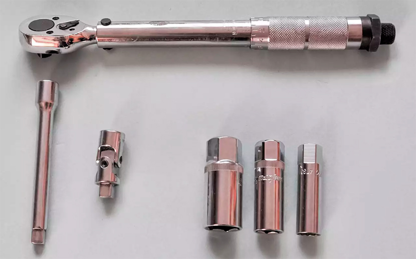 Правильный набор инструмента для замены свечей включает в себя свечную головку размером 14, 16 или 21 мм со встроенным элементом, удерживающим свечу, а также карданчик, удлинитель и динамометрический ключ с предельным моментом затяжки не более 40 Н*м.