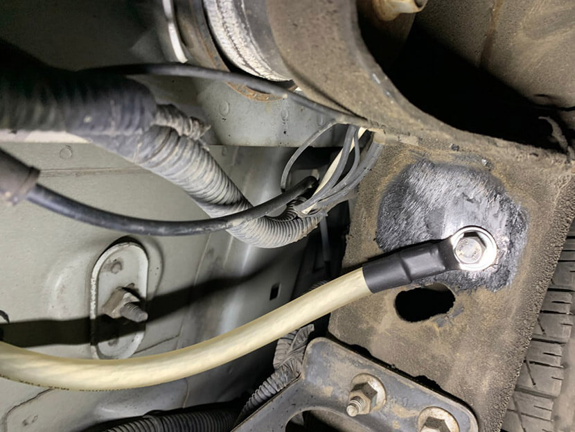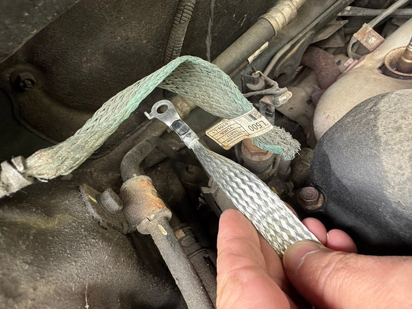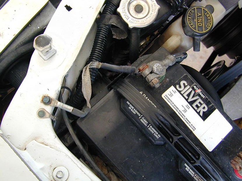 3. Провод массы от двигателя к кузову/раме, часто толстый, который находится в зоне высоких температур, грязи, влаги, — клеммы окисляются, провод ломается. Это одна из самых распространенных проблем с «землей».