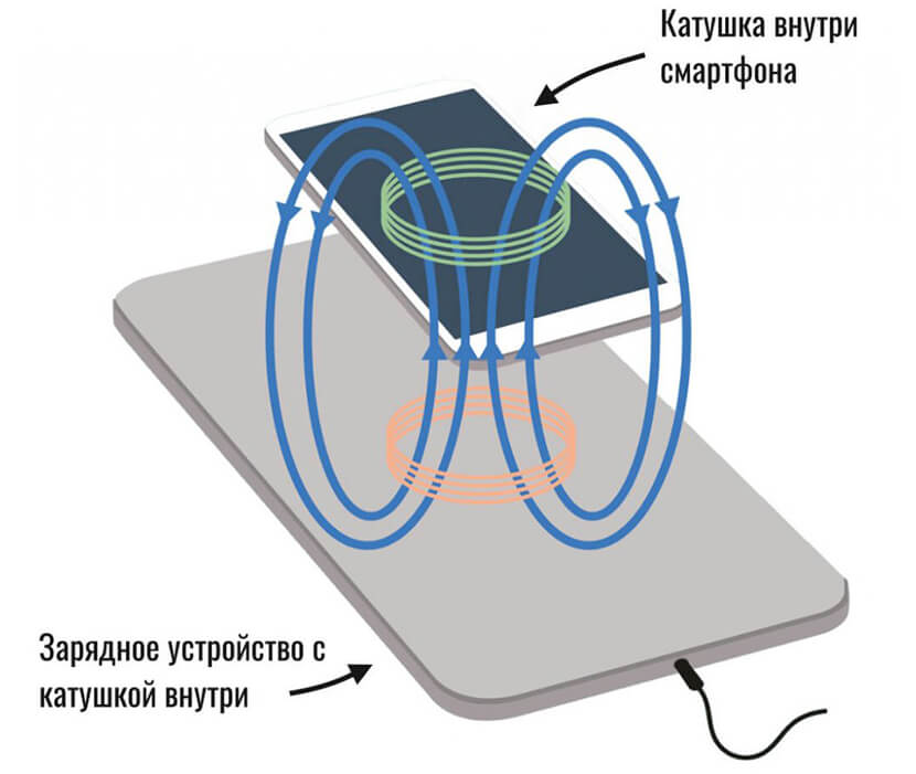 В беспроводных зарядных устройствах применяются электромагнитные катушки, которые создают магнитное поле между передатчиком и приемником. Побочным эффектом электромагнитной индукции является перегрев заряжаемых гаджетов.