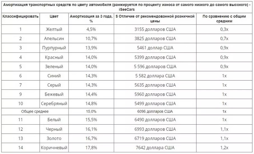Своеобразный отчет в этом году опубликовало американское аналитическое агентство ISeeCars, чья работа, как правило, основана на соцопросах и данных страховых компаний. На этот раз его специалисты проанализировали 650 тысяч сделок купли-продажи подержанных автомобилей возрастом около трех лет, то есть 2019 модельного года, и выяснили, что к потере 15% их первоначальной стоимости могут добавиться иные издержки, связанные с цветом кузова конкретного авто.