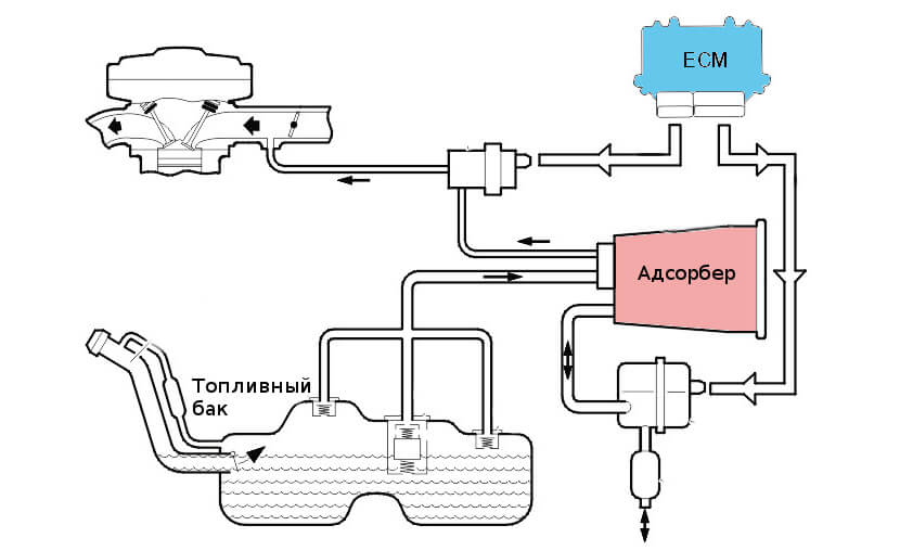 Ведь топливо в бензобаке испаряется даже тогда, когда автомобиль стоит на приколе, особенно в жару. Так, испаряющийся в емкости бензин идёт по трубкам в абсорбер, где попадает в ёмкость с активированным углём. Последний способен впитывать в себя углеводороды, не допуская их попадания в атмосферу. Ресурс (хотя точнее будет сказать ёмкость фильтра с активированным углем) ограничен, из-за чего ему требуется та самая продувка, описанная выше, в результате которой пары бензина опять попадают во впуск. В итоге получилась изящная замкнутая система, которой остались надолго удовлетворены и экологи, и бережливые автомобилисты. Правда, есть одно но: абсорбер имеет свойство ломаться.
