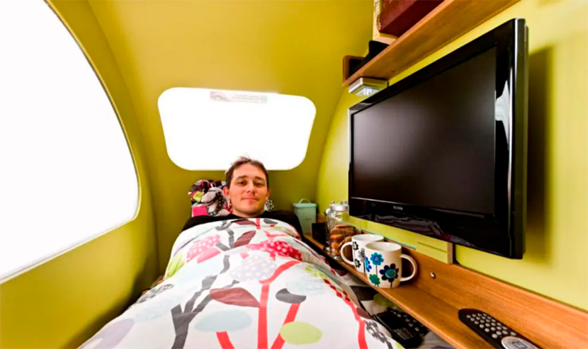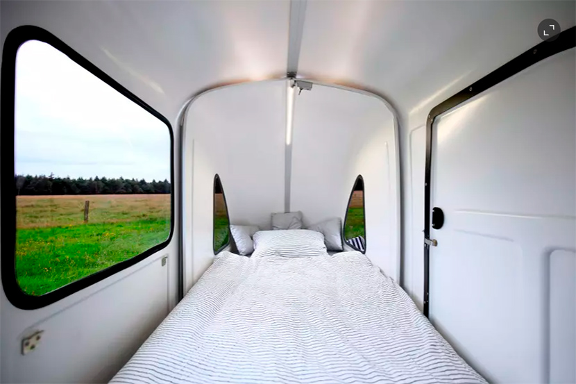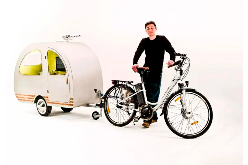 Сразу стоит отметить, что данный кемпер одноместный: его длина составляет 2 метра, а ширина – всего 75 сантиметров. Зато внутри хватает пространства, чтобы вместить магнитолу, книжную полку с мини-баром и даже 19-дюймовый телевизор! Прелесть раздельных с транспортом жилых модулей еще и в том, что, добравшись до кемпинга, вы отсоединяете дом и сохраняете мобильность благодаря велосипеду.