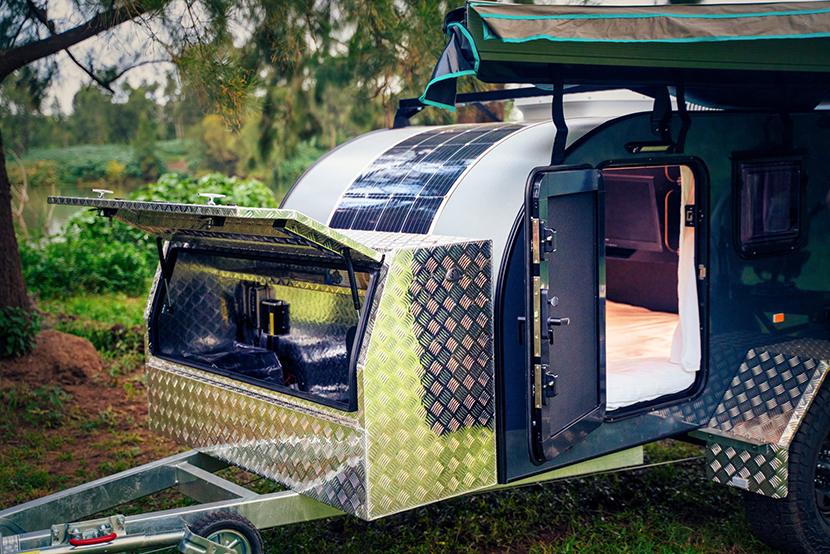 Внутри жилого модуля, выполненного из алюминия, размещается двуспальная кровать шириной 1,4 метра, светильники, деревянный шкафчик, розетки, вентилятор на крыше и окна с москитными сетками. В задней части модуля расположен шкаф-органайзер для походной кухни, поверх которой можно раскатать встроенный тент.