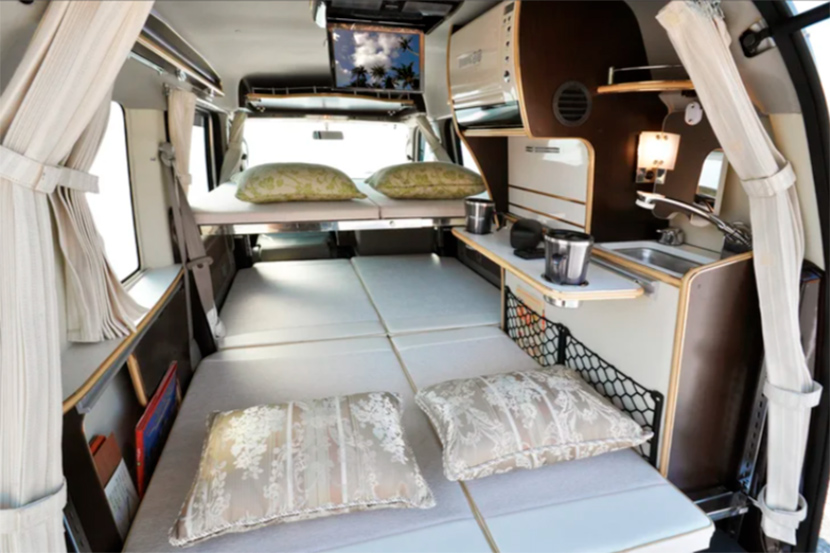 К примеру, небольшой автомобильчик Suzuki Every фирма Nuts RV «нафаршировала» таким количеством полочек и скрытых ящичков, что в них можно перевезти даже скарб многодетной семьи. При этом в машине есть мини-кухня с кофеваркой и раковиной, а два пассажирских дивана легко превращаются в одно большое спальное место.