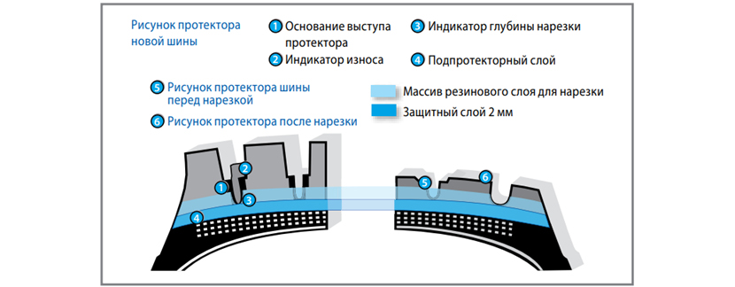 При такой толщине протекторного слоя нарезанная шина не будет соответствовать своим эксплуатационным характеристикам, и с дорогой в этом случае контактировать станет уже неэластичный подпротекторный слой. То есть на эффективное торможение или хорошую управляемость рассчитывать не приходится. Для зимних шин такое обращение особенно критично, так как иные бренды размещают подпротекторный слой практически сразу на глубине не больше 4 мм.