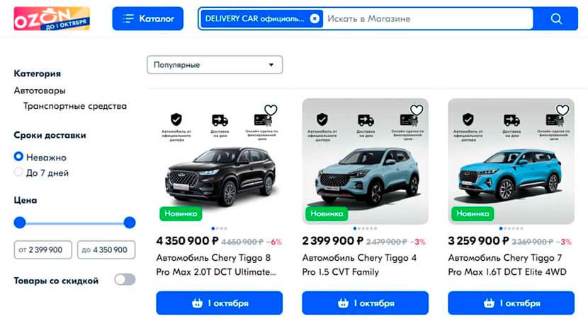 Возможно, о таком аттракционе невиданной щедрости вспомнили крупные маркетплейсы, решив реализовывать через собственные площадки продукцию автомобильных дилеров. Так, в середине ноября на ресурсе OZON в категории «Автомобили» помимо различных аксессуаров пользователи могли приобрести реально существующие модели Chery Tiggo 4 Pro в кузове белого цвета и в базовой комплектации с коробкой передач вариаторного типа и атмосферным мотором 1.5L с дисконтом 10% реальной розничной цены (то есть за 1.999.990 RUB).