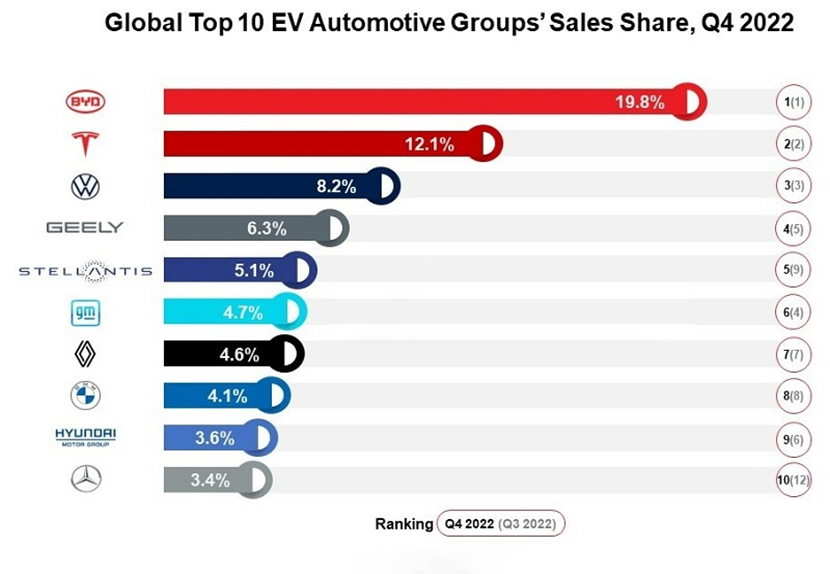 Спустя десять лет брендам из КНР удалось повысить качество выпускаемой продукции и освоить производство многих перспективных видов техники, к которым относятся в том числе и электрокары. Любопытно, что продажи электромобилей в 2022 году, по данным аналитического ресурса Counterpoint, составили 10,2 млн единиц. Причем лидером по продажам, вопреки расхожему мнению, стала не американская Tesla, а китайский холдинг BYD, на долю которого пришлось 19,8% общего объема (у Tesla только 12,1%).