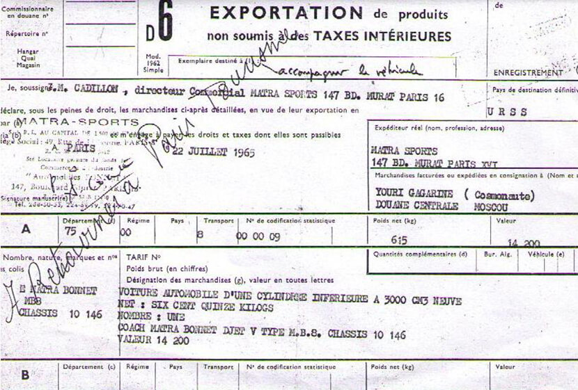 Однако исторически правдивым является другой факт: во время посещения авиасалона в Ле-Бурже в 1965 году Юрий Гагарин был потрясен спортивным автомобилем Matra Bonnet Djet V S coupé. Космонавт вертелся вокруг него более получаса и был очень рад, когда представители стенда Matra позволили ему сесть за руль этого купе и проехать по одной из дорожек комплекса.