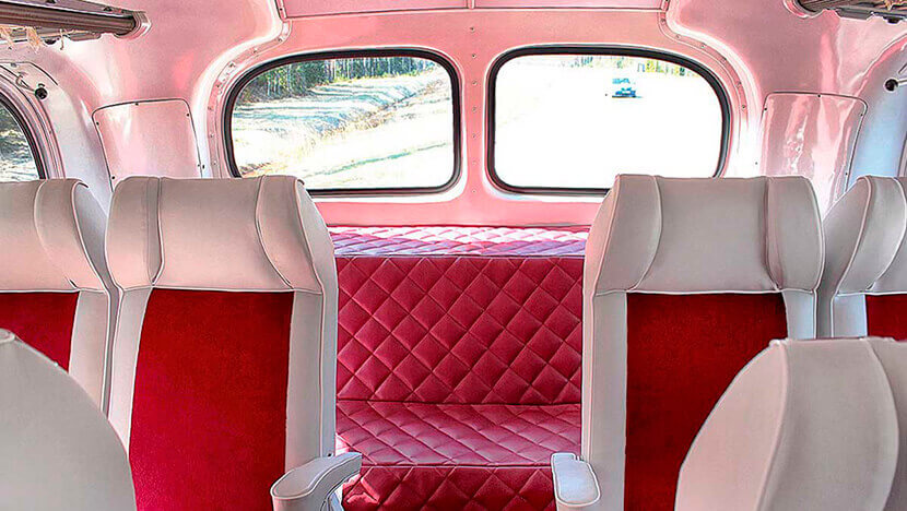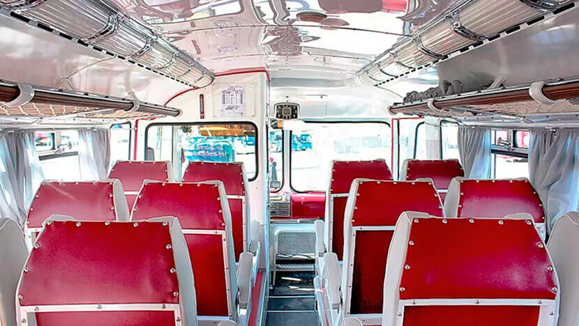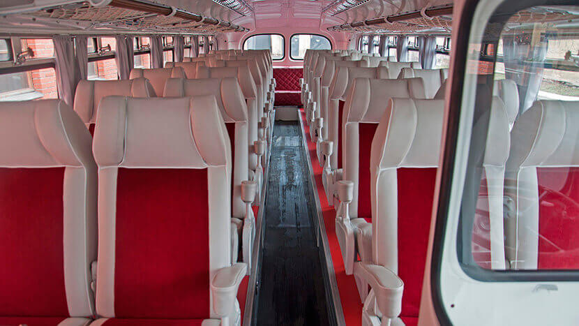 Спинки и подушки кресел регулировались пассажирами. Над каждым местом размещались индивидуальный источник света и вентилятор. Над креслами также были закреплены сетки для ручной клади, а под полом с обеих сторон машины имелись два просторных багажных отсека, хорошо изолированных от дорожной пыли. Как раз между ними размещался топливный бак.