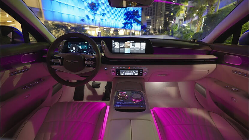• «атмосферный режим»: возможность выбирать из множества предустановленных сцен (например, тропический лес, пурпурный закат), которые меняют не только цвет, но и интенсивность подсветки в разных зонах салона. В EV6/Ioniq 5 подсветка дверных карт напоминает пиксели, добавляя футуризма;