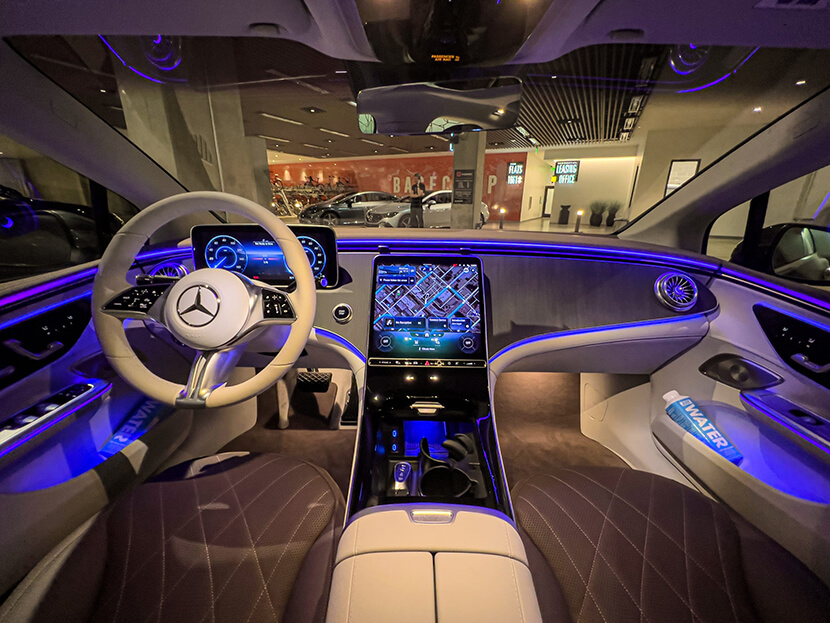 «Волны света» от Mercedes – самая продвинутая серийная система. Сотни отдельных светодиодов создают непрерывные световые линии по всему периметру салона – на торпедо, дверях, центральной консоли, задней полке. Но главное – динамика! Свет может «течь» от одной двери к другой, пульсировать в такт музыке (особенно с системой Burmester), плавно менять цвета, создавая «дыхание» салона. При срабатывании систем помощи (например, торможение перед препятствием) подсветка может вспыхивать красным. Это уже не просто свет, а световая коммуникация и иммерсивное шоу.