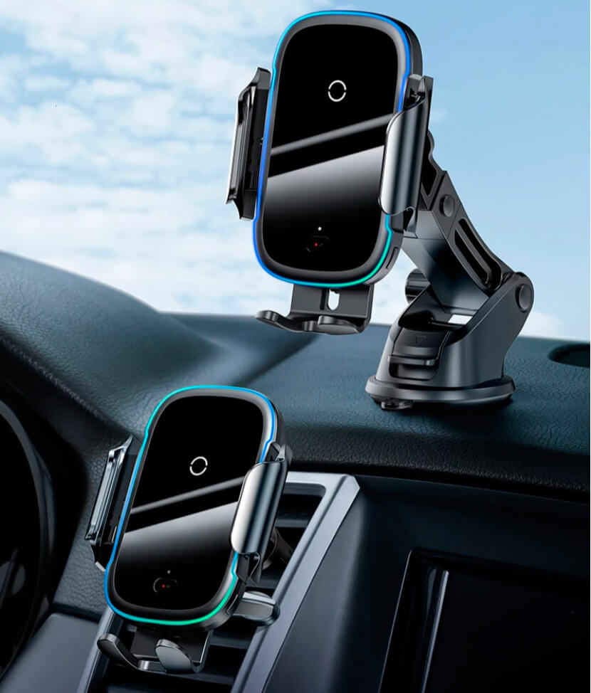 Модель для тех, кто хочет за минимальную стоимость получить максимум. Один из самых бюджетных держателей у нас в списке, а в наличии 15 Вт мощности, автоматический зажим с фотодатчиком и корпус из алюминиевого сплава. Подходит для телефонов с диагональю от 5,4" до 7,2". В основании расположен поворотный механизм, благодаря которому «держалка» поворачивается на 360°. Дополнительные фишки включают защиту от перегрева, повышенного и пониженного напряжения, короткого замыкания, а также приятную светодиодную подсветку во время зарядки. Интерфейс подключения – USB Type-C.