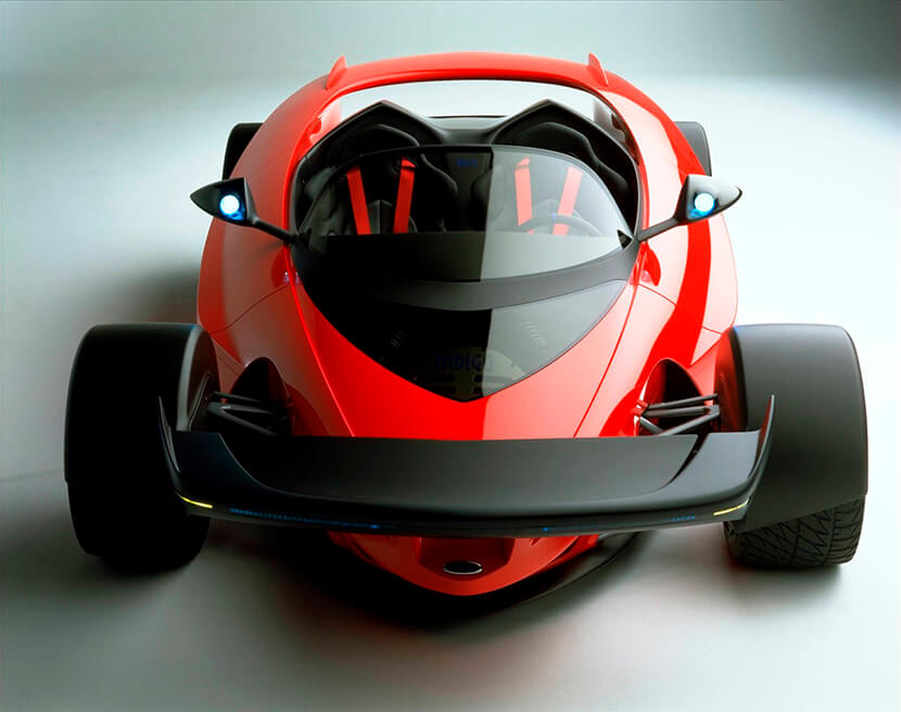 Высота спорткара составляла всего метр. При этом корпусом Indigo походил на гигантское насекомое из-за выступающего переднего «антикрыла», выполнявшего функцию бампера, со встроенной в него светодиодной оптикой и дверями гильотинного типа. Фары головного света размещались в корпусах боковых зеркал заднего вида, а задняя оптика целиком была встроена в кормовое «антикрыло».