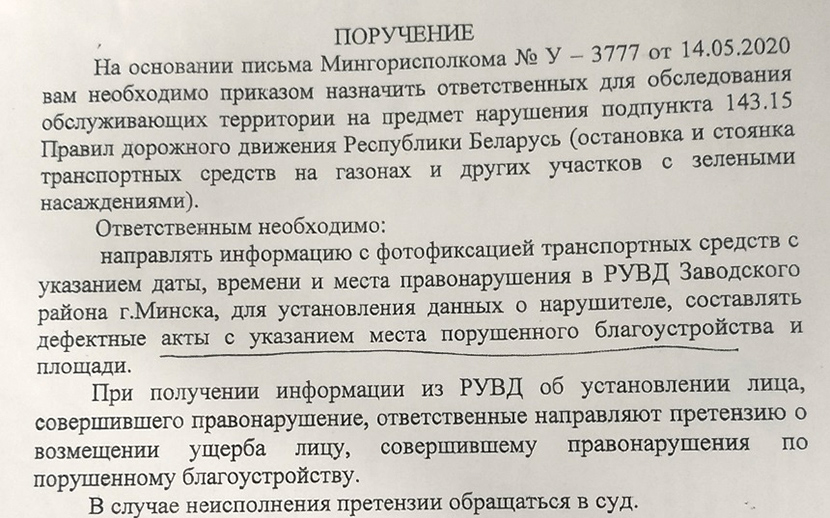 В распоряжении редакции есть довольно интересный документ под названием «Поручение», из которого следует, что на основании письма Мингорисполкома №У-3777 от 14.05.2020 директорам государственных предприятий ЖЭУ необходимо назначить ответственных лиц для обследования территорий на предмет нарушения п.145.15 ПДД (остановка и стоянка транспортных средств на газонах и других участках с зелеными насаждениями).