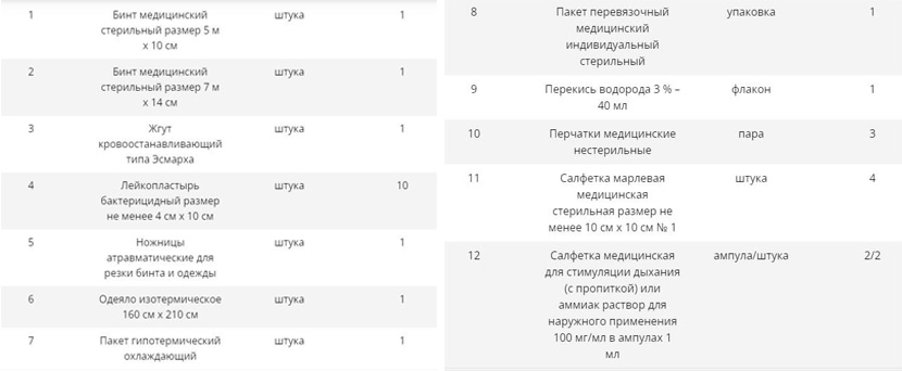 В соответствии с новым постановлением теперь автомобильная аптечка включает в себя 12 наименований медикаментов и медицинских изделий. К таковым относятся: стерильные медицинские бинты двух размеров (5 м х 10 см, 7 м х 14 см), кровоостанавливающий жгут типа Эсмарха, бактерицидный лейкопластырь, атравматические ножницы для резки бинта и одежды, изотермическое одеяло, гипотермический охлаждающий и перевязочный медицинские индивидуальные пакеты, перекись водорода 3%, медицинские нестерильные перчатки, марлевая медицинская стерильная салфетка, салфетка для стимуляции дыхания или раствор аммиака для наружного применения.