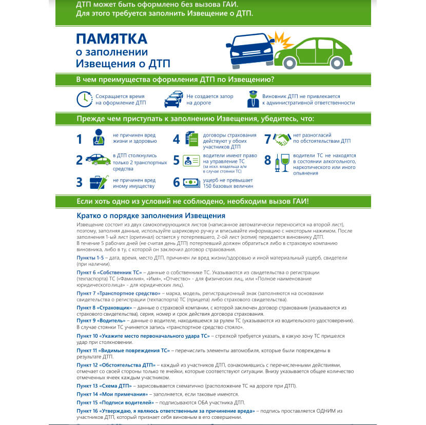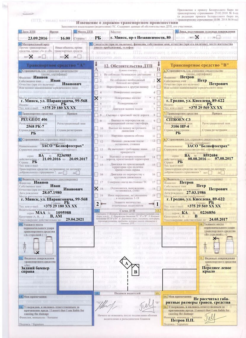 Итак, авария произошла, небольшая, поэтому, сберегая время, оформляем европротокол. Порядок заполнения извещения детально регламентирован Инструкцией о порядке заполнения бланка извещения о дорожно-транспортном происшествии, утвержденной Приказом Белорусского бюро по транспортному страхованию 25.02.2010 № 6-од.