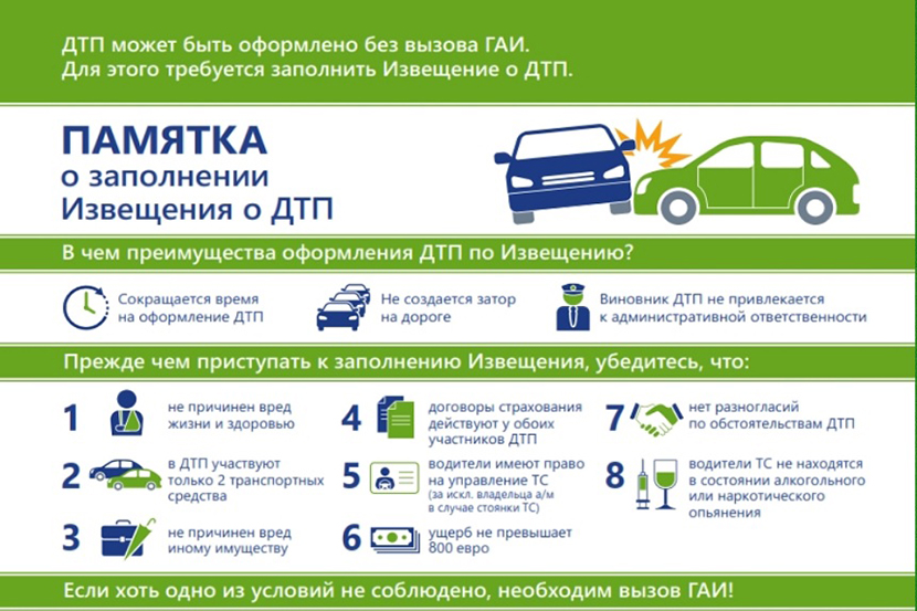 И только при наличии всех этих условий, что очень важно – одновременно , участники ДТП вправе заполнить бланк извещения о ДТП без вызова ГАИ, так называемый европротокол.