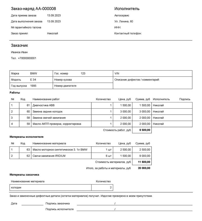 Согласно пункту 93 Правил, при оказании бытовых услуг по техническому обслуживанию и ремонту механических транспортных средств, помимо документа, подтверждающего факт оказания данной бытовой услуги, оформляется документ, подтверждающий заказ.