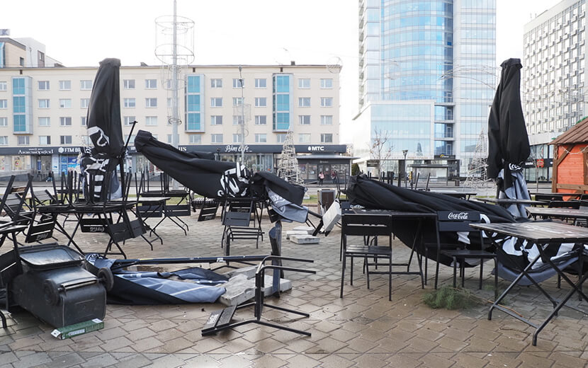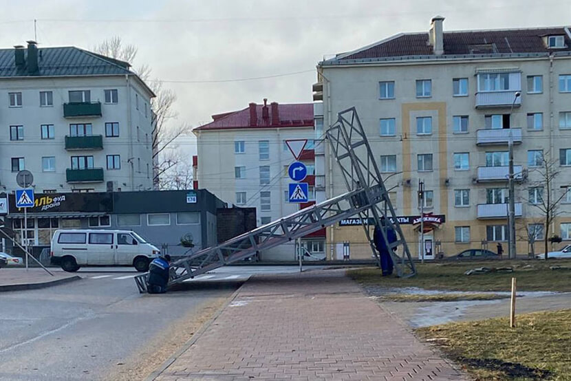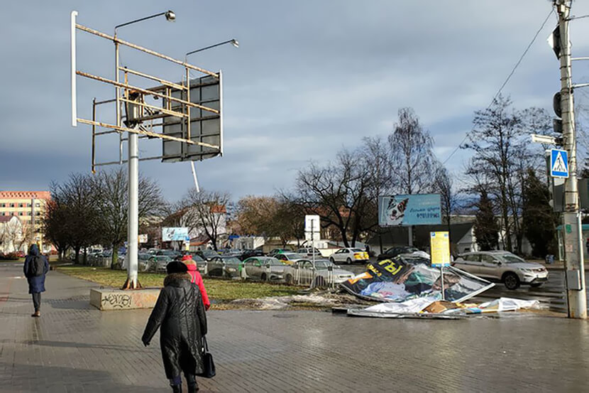 Пролетели выходные, которые, кроме похолодания, принесли еще и сильный ветер. МЧС разослало сообщения с предупреждением, так как разбушевавшаяся стихия ломала деревья и срывала элементы рекламных конструкций с фасадов зданий. К примеру, на трассе М6 в нескольких километрах от Минска ветер оборвал рекламное полотно – сейчас там стоит лишь голый столб, а в субботу 2 ноября сама конструкция полотна валялась рядом.