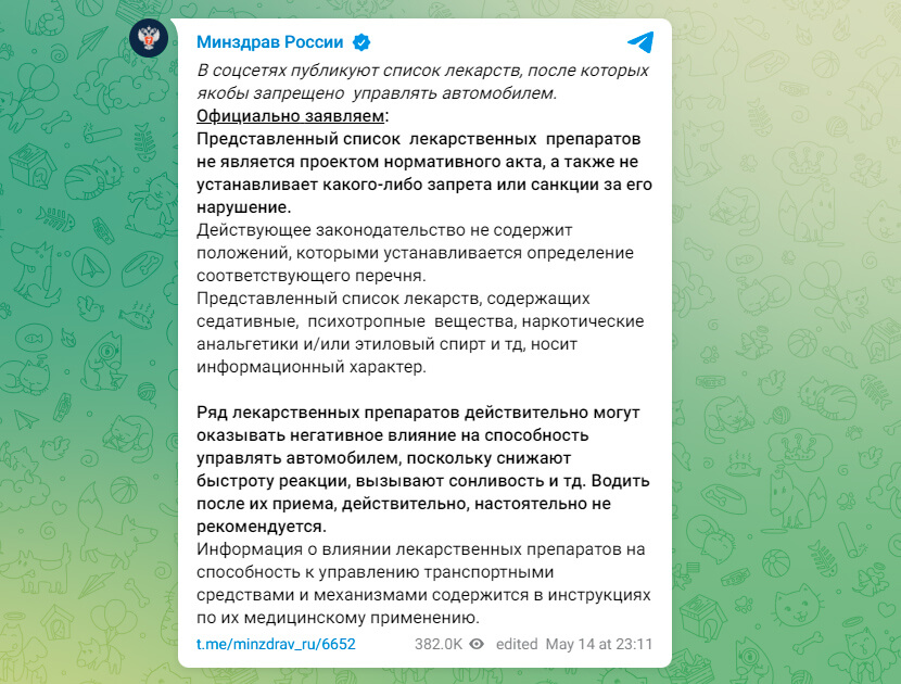 В России в последнее время распространяется в соцсетях список лекарств, после приёма которых якобы запрещено управлять автомобилем. Минздрав России по этому поводу разъяснил, что действующее законодательство не содержит положений, которыми устанавливается определение соответствующего перечня…