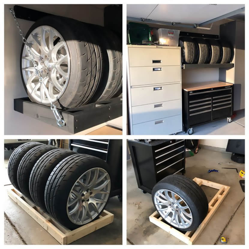 Если сдаются на хранение шины на дисках (колеса в сборе), то они должны подвешиваться либо складываться друг на друга, но не более четырех штук в стопке.