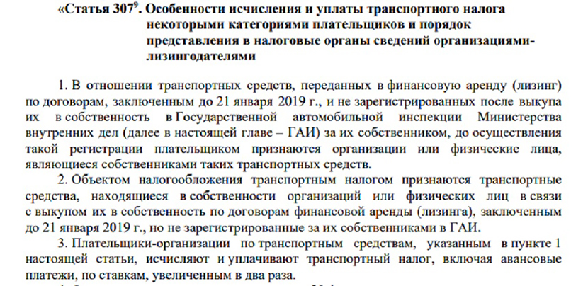 При передаче транспортного средства в финансовую аренду (лизинг) плательщиком признается лизингополучатель. Теперь же данный абзац дополнен фразой «с учетом особенностей, установленных п.1 ст.307-9 НК».