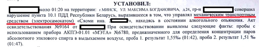 Справедливости ради стоит отметить, что такая практика сложилась не везде, в большинстве известных нам случаев применялась именно в столице. Но при повторном попадании в поле зрения минской ГАИ лиц «под градусом», управлявших электросамокатом, в их отношении даже возбуждали уголовные дела.