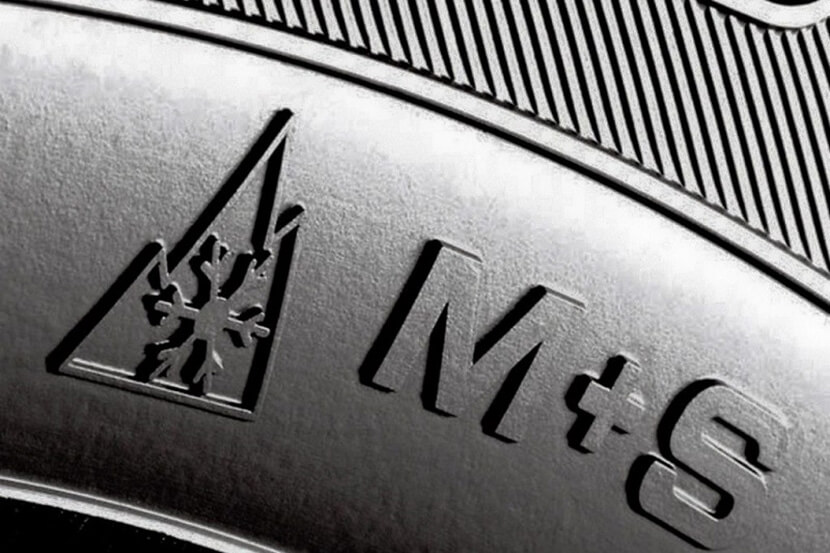 - быть маркированы знаком в виде горной вершины с тремя пиками и снежинки внутри нее и одним из знаков "M + S", "M&S", "MS" (при отсутствии индикаторов износа);